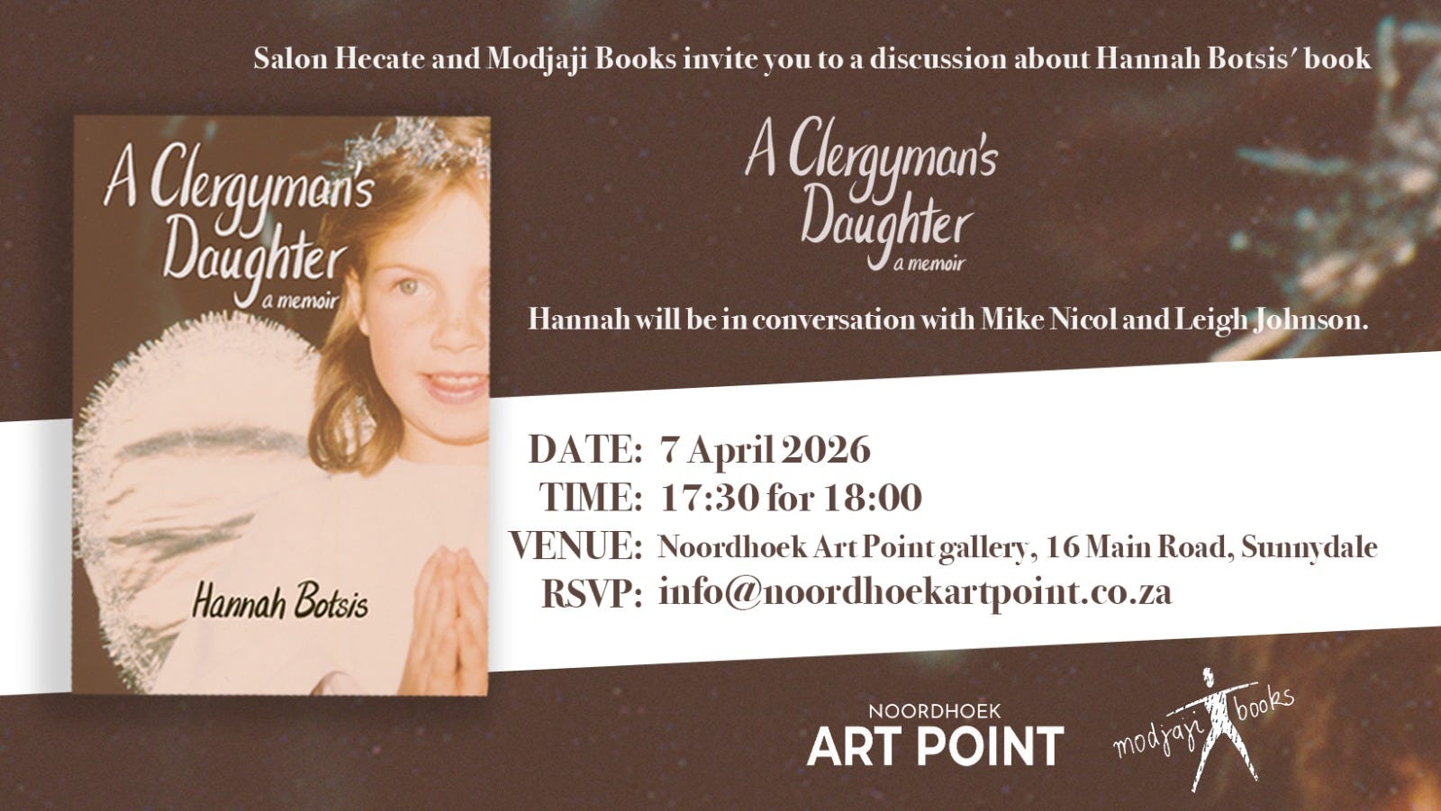 Very excited to be talking to Mike Nicol at Salon Hecate in Noordhoek next Tuesday. If you are in the deep south, please do come through and spread the word!